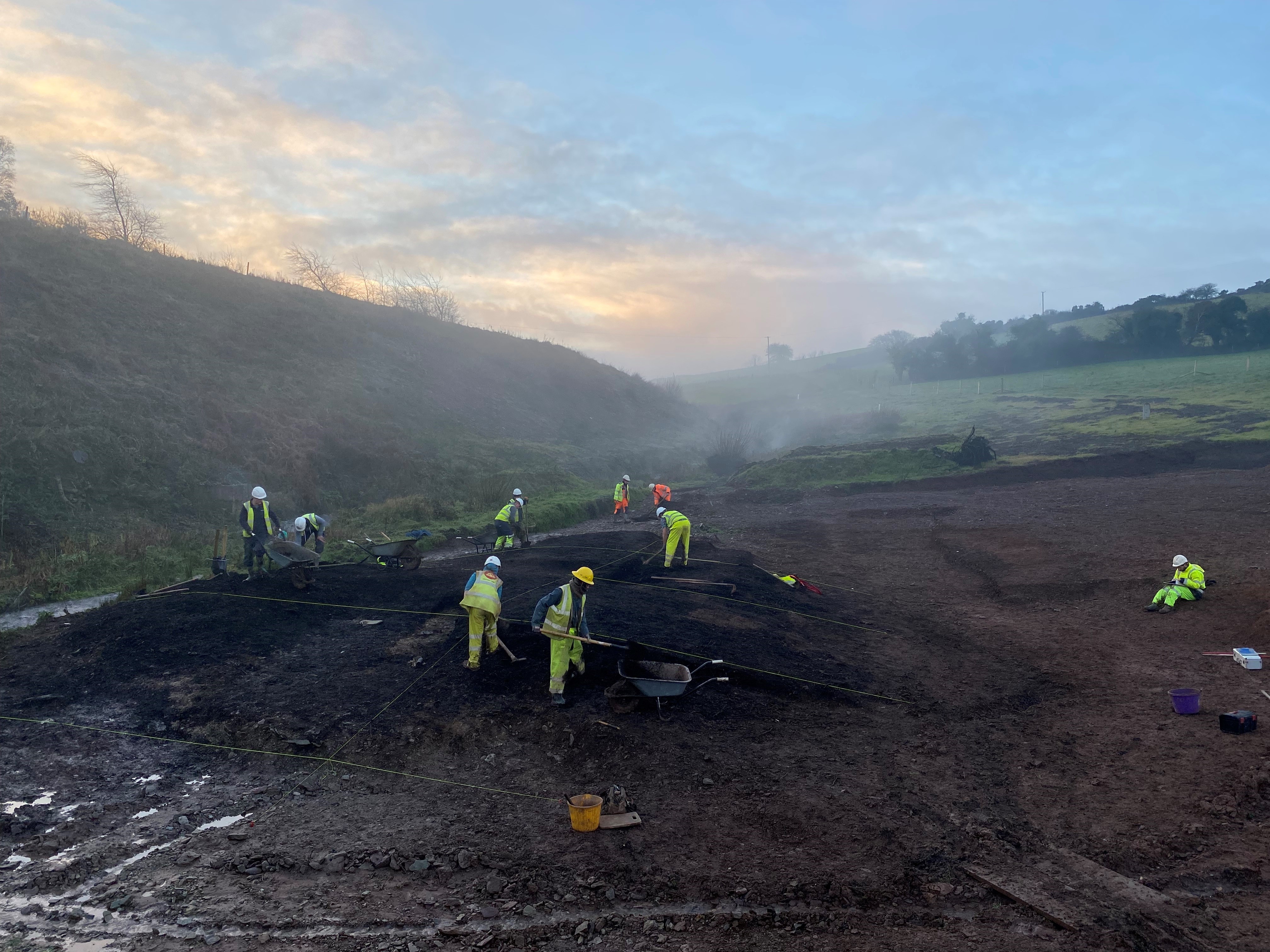 Several fulachtaí fia/burnt mounds were excavated across the scheme. A large example, a previously known site, was unearthed at Shannonpark. This site type typically dates to the Bronze Age. They are recognised as a mound or spread of heat-shattered stones and charcoal-rich soil, usually found in association with one or more troughs set in to the ground, and are generally found next a water source. The stones would have been heated in a fire, and thrown into a water-filled trough in order to heat the water, perhaps for bathing, cooking, or other purposes.